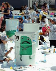 في المشهد نفسه، يفرش المشاركون عدة الرسم على الأرض، يشمرون عن سواعدهم، وينطلقون في الرسم. وفي المكان مئة وعشرون مستوعباً، انبرى أعضاء كل فريق لتزيينه، مستندين إلى صور ورسوم صمموها.
