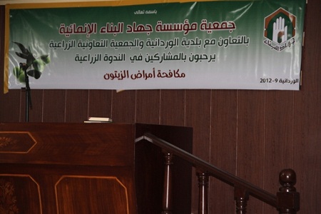 ضمن نشاطاتها الإرشادية للمزارعين، ومع إقتراب موعد قطاف الزيتون، أقامت جمعية مؤسسة جهاد البناء الإنمائية ، بالتعاون مع بلدية الوردانية والجمعية التعاونية الزراعية في البلدة ندوة تحت عنوان" كيفية مكافحة أمراض الزيتون".