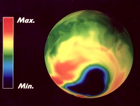 وقد بدأ الثقب يتكون سنويا فوق القطبين الشمالي والجنوبي منذ بداية العقد العام 1980 مع استعمال الانسان مكونات الكلوروفلوروكربون في أنظمة التبريد والرذاذ.