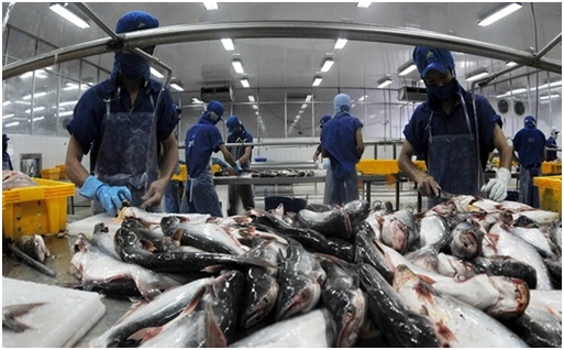 على السيور المتحركة في خط التجميع يقف مئات من العمال مرتدين كمامات وأغطية للرأس، وأمامهم الأسماك المنزوعة الحسك والقشور الموضوعة في سلال بلاستيكية زرقاء، ويقومون بتقطيع السمك بشكل محدد. هكذا يبدو مصنع تجهيز الأسماك الفيتنامية المملوك لشركة المأكولات البحريةHiep Thanh Seafood في إحدى الإعلانات المصورة.